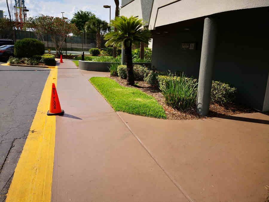 In hopes to improve the appearance of the property, they painted a half mile of sidewalk. It looked beautiful color coordinated and all. The next time it rained on the newly painted sidewalk, 5 of their guests slipped and fell. They realized this had to be repaired right away. ½ mile is a lot of sidewalk.